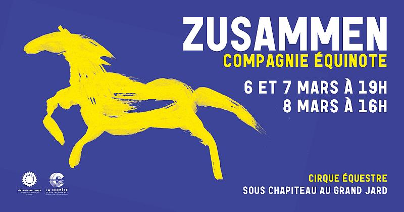 Découvrez La compagnie Équinote et son spectacle équestre Zusammen lors de 3 représentations sous chapiteau au Grand Gard de Châlons près du kiosque ! Dans cette nouvelle création, la compagnie mêle cirque et théâtre équestre en tentant de dissoudre la frontière entre humain et l’animal.