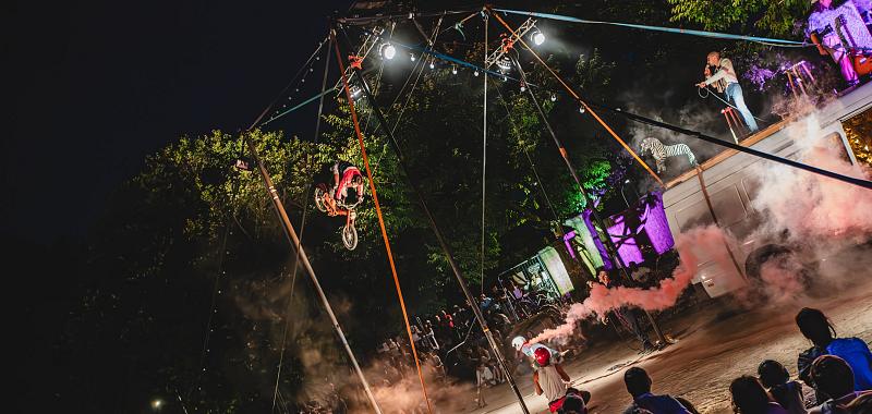Une soirée inédite pour un cocktail explosif de corps propulsés dans les airs, d’acrobaties virtuoses en tous genres…une moto est suspendue ! Elle se balance au-dessus du vide, elle se cabre, virevolte et se redresse puis repart dans un élan…